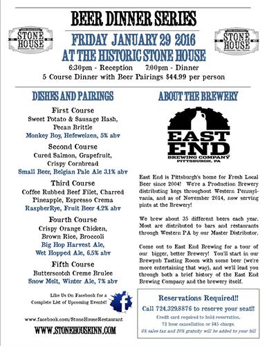 Join us for another fabulous Beer Dinner Series featuring Pittsburgh's own East End Brewing Company. Reception starts at 6:30pm Dinner at 7pm. $44.99 per person